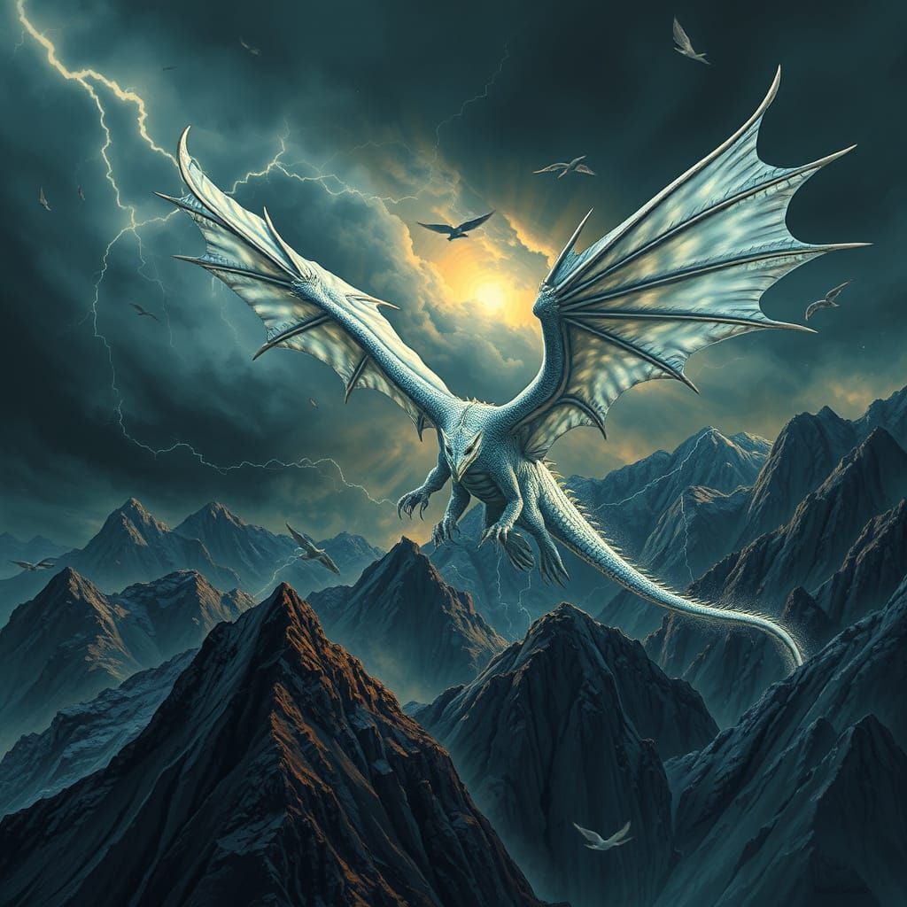 Digital painting. Medium shot. A majestic silver dragon soars over the mountains through a stormy sky, its wings spread wide against the wind, lightning flashes illuminate its scales, dramatic lighting creates a sense of awe and power. Best quality, a masterpiece, deep color, 8k resolution, trending ...
