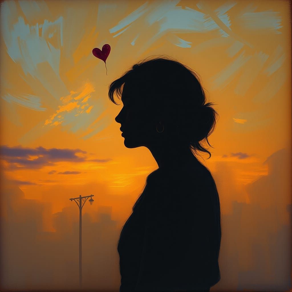 This image features a charcoal painting of a woman lost in thought under a twilight sky. Warm colors and expressive brushstrokes create a melancholic and contemplative mood.