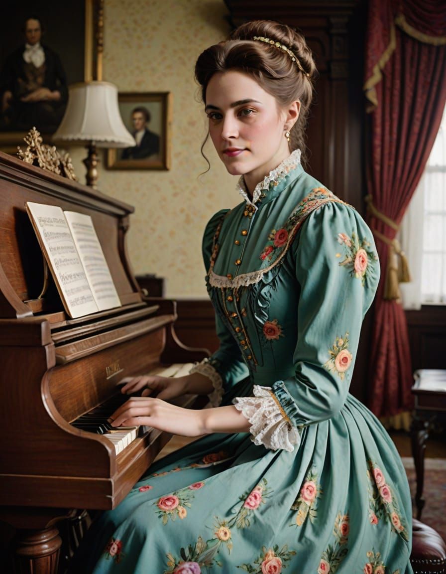 This image shows a serene young woman in a vibrant day dress playing the piano in a charming parlor setting, exuding a sense of gentle elegance.