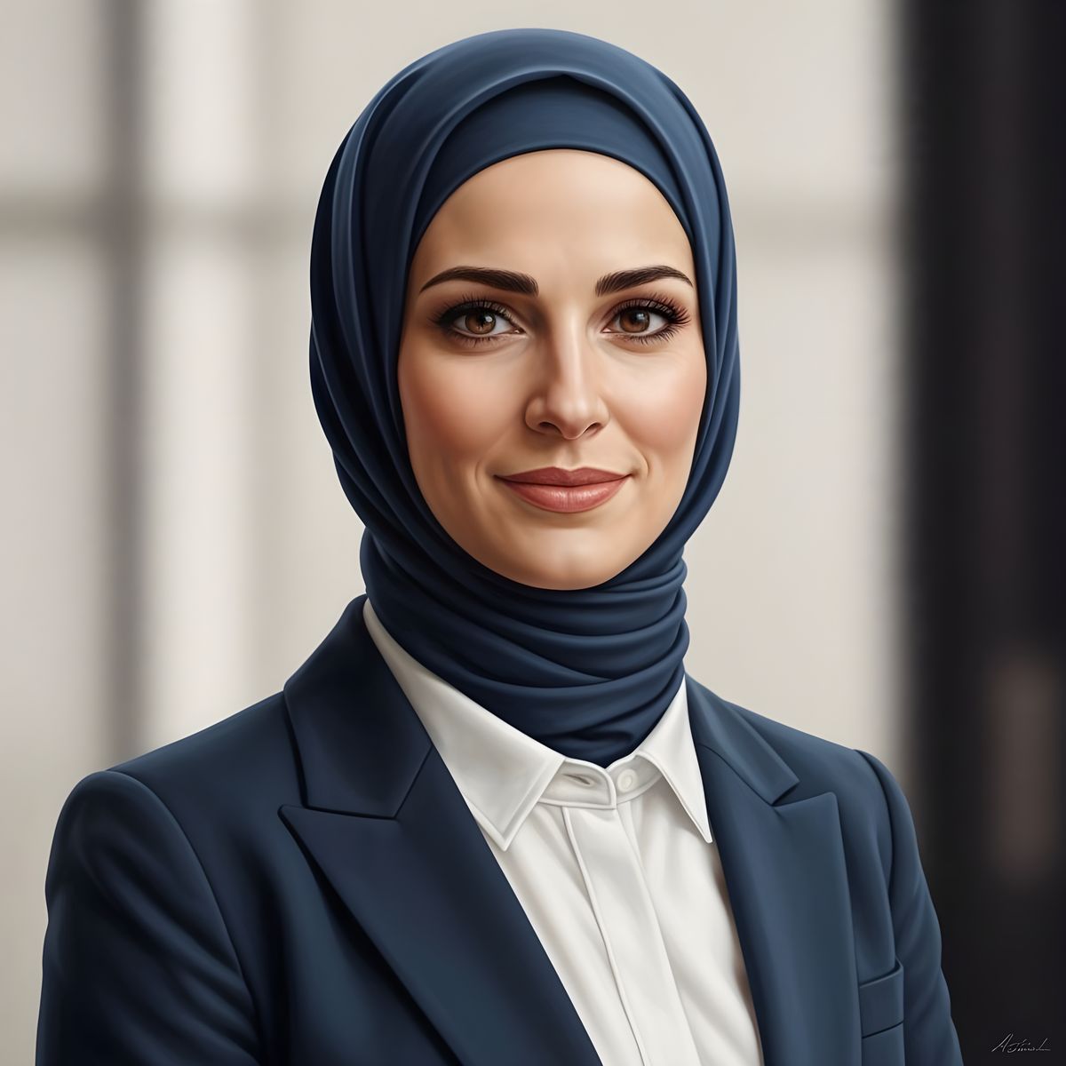 A realistic portrait of a German business woman wearing a dark blue hijab. The image features intricate details and textures, capturing a sense of confidence and professionalism.