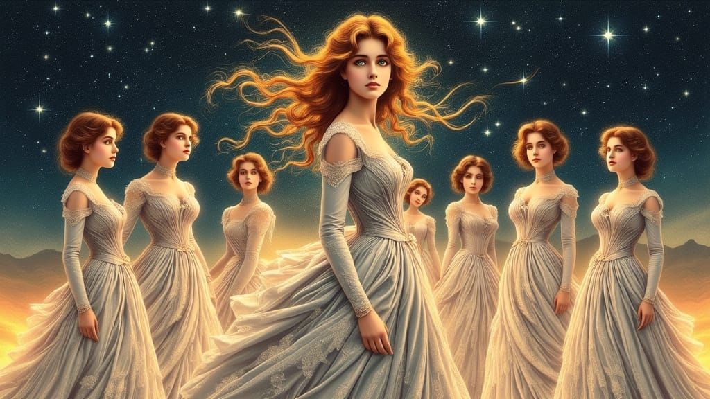 A celestial art nouveau image of seven sisters in flowing gowns under a starry sky. The artwork features intricate details and a dreamy, surreal quality, reminiscent of the Gibson Girl style.