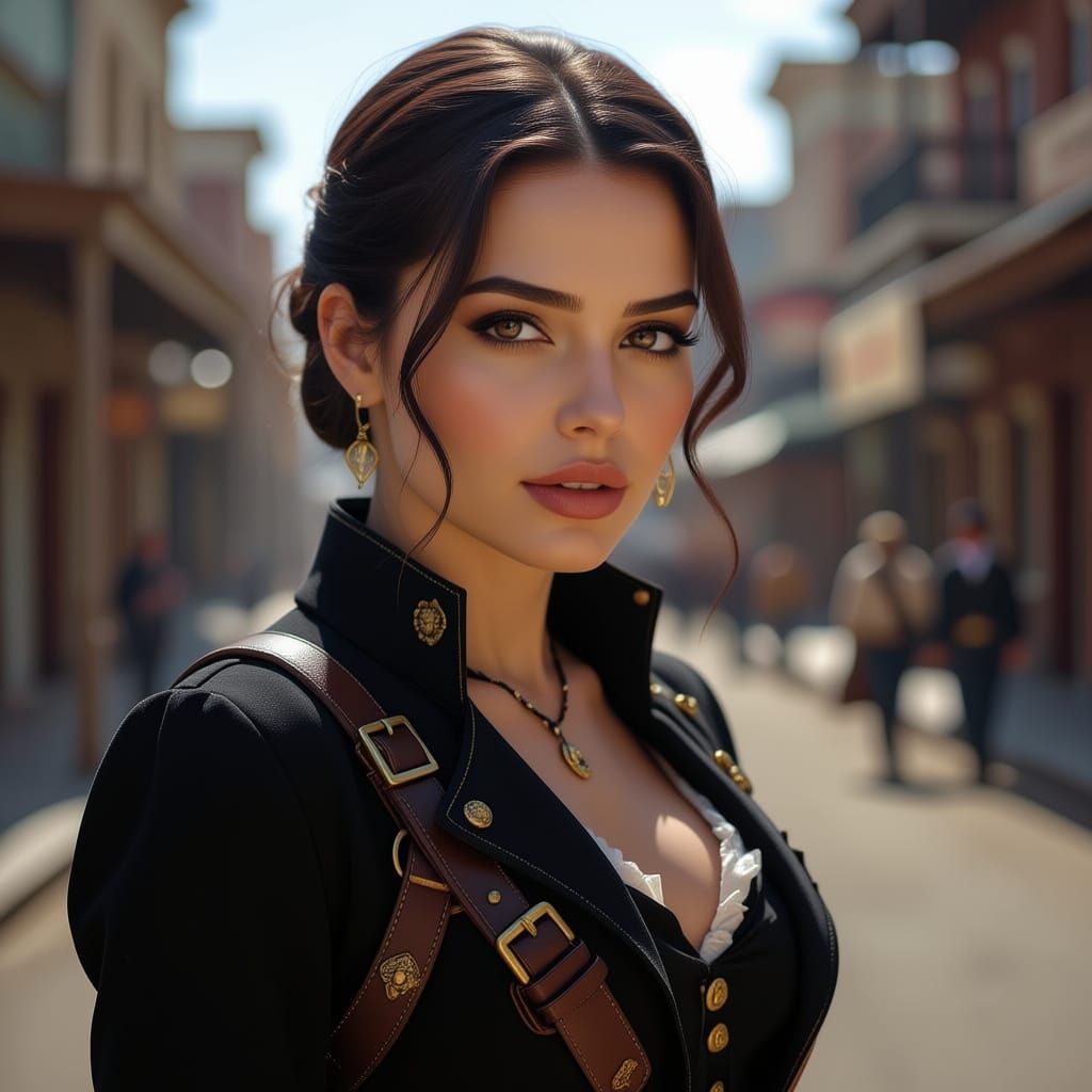 This hyperrealistic image features a woman with dark red hair in a wild west outfit with Italian mob style, armed with two pistols. The cinematic scene captures a moody, high-contrast western city street.