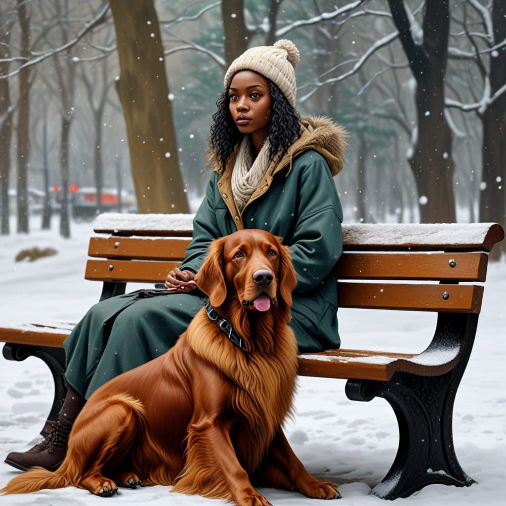 This image is a beautiful oil painting of an African girl and her dog sitting on a bench, surrounded by falling snowflakes and strong winds blowing through the trees. Created in a Gouache-inspired style with thick brushstrokes and textured layers, this epic impressionist masterpiece is a stunning work of...