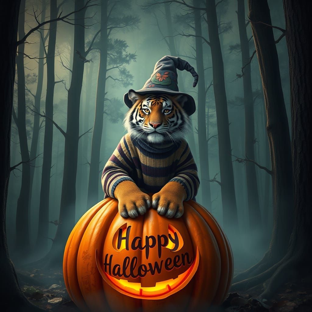 A realistic tiger with a Halloween costume is sitting on a pumpkin. The tiger is wearing a wizard's hat and a striped sweater. The pumpkin has a happy face and the words "Happy Halloween" are carved into it. The background is a spooky forest with tall trees and a foggy atmosphere