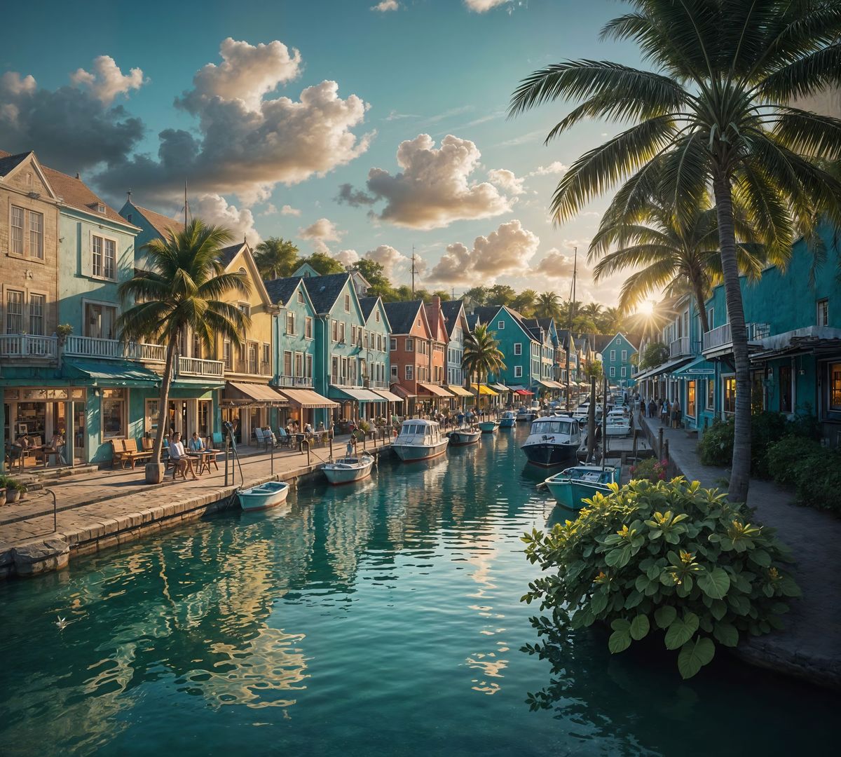 A vibrant digital artwork capturing Kralendijk's marina. Bonairian design meets Dutch Colonial architecture, reflected in colorful buildings. The harbor view features Divi Divi trees, Aloe Vera, cacti, and turquoise Caribbean waters.