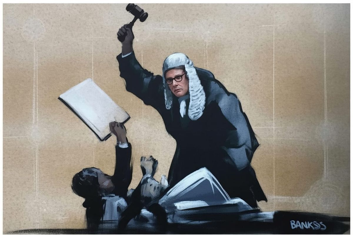 This image shows Judge Keir Starmer wearing glasses and raising his gavel. The artwork is rendered in the distinctive stencil style of Banksy.