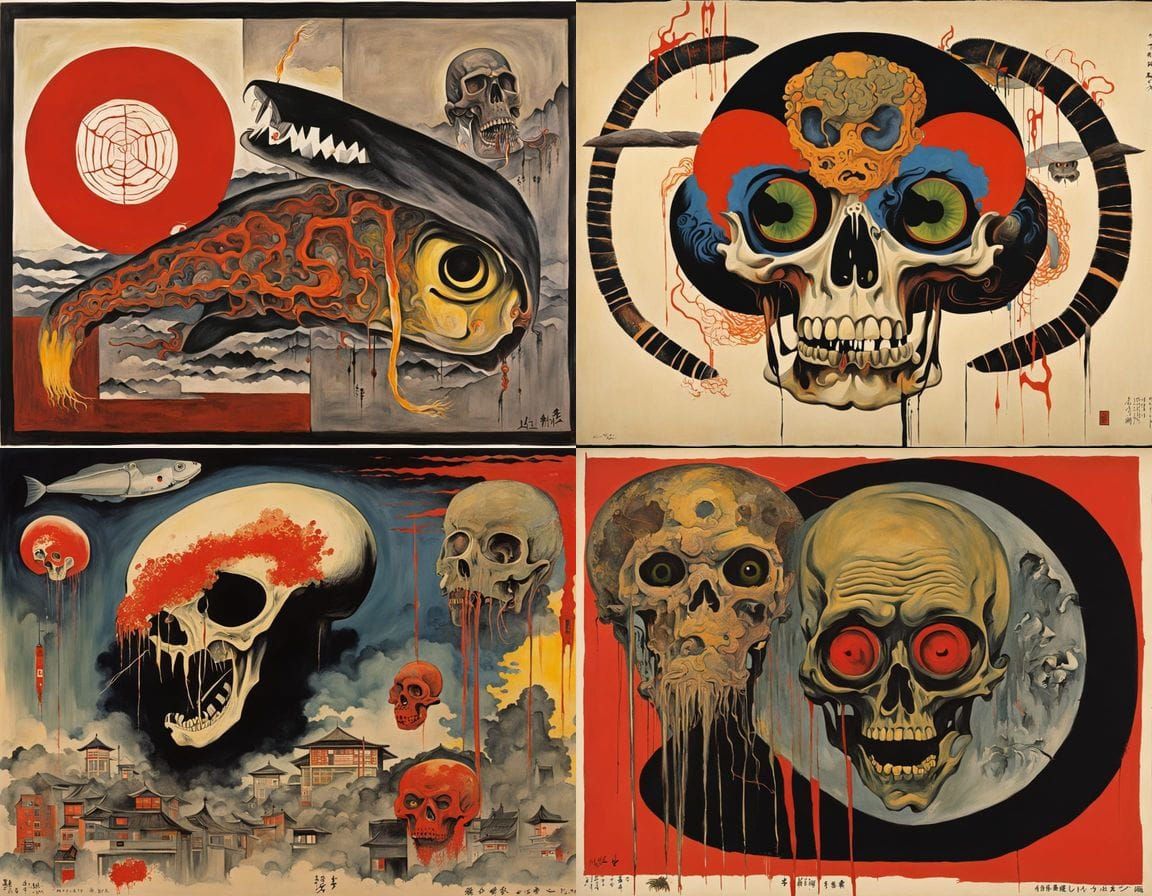 This image depicts a grotesque scene of Yakuza violence in 1950s Japan. The image features a nightmarish creature with exposed organs, rendered in a surreal art deco style.