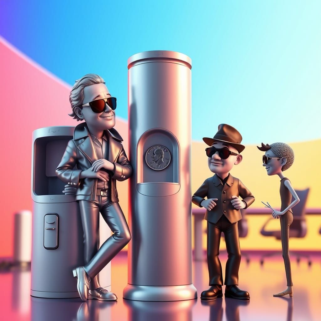 This 3D digital art showcases sentient coins socializing by a futuristic water cooler. The vibrant scene features cinematic lighting and detailed shading, evoking a playful, animated style.