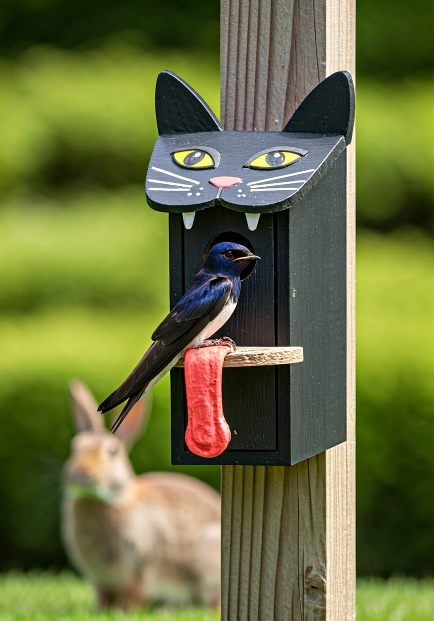 This image shows a striking Purple Martin perched at the entrance of a unique cat-shaped birdhouse. In the background, a curious rabbit adds to the whimsical backyard scene.
