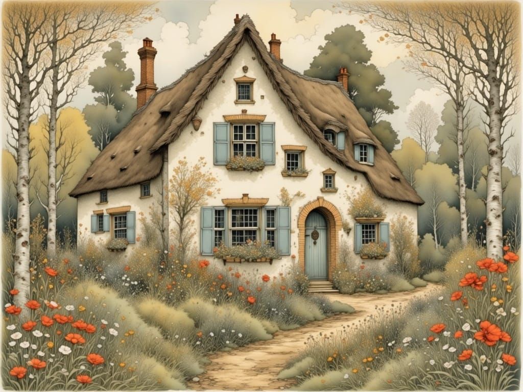 This image showcases a meticulously detailed and cozy home nestled within an intricately entangled, lush landscape, rendered with a rich artistic style.