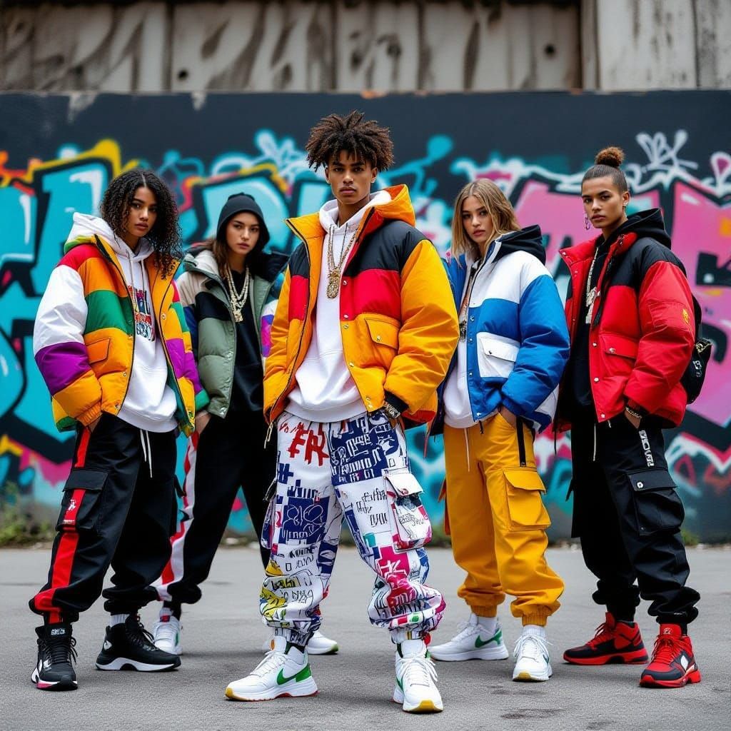 This image features diverse teenagers in vibrant streetwear, posing confidently in an urban setting with graffiti art. Captured in a dynamic, high-fashion photography style with dramatic lighting and a cinematic feel.