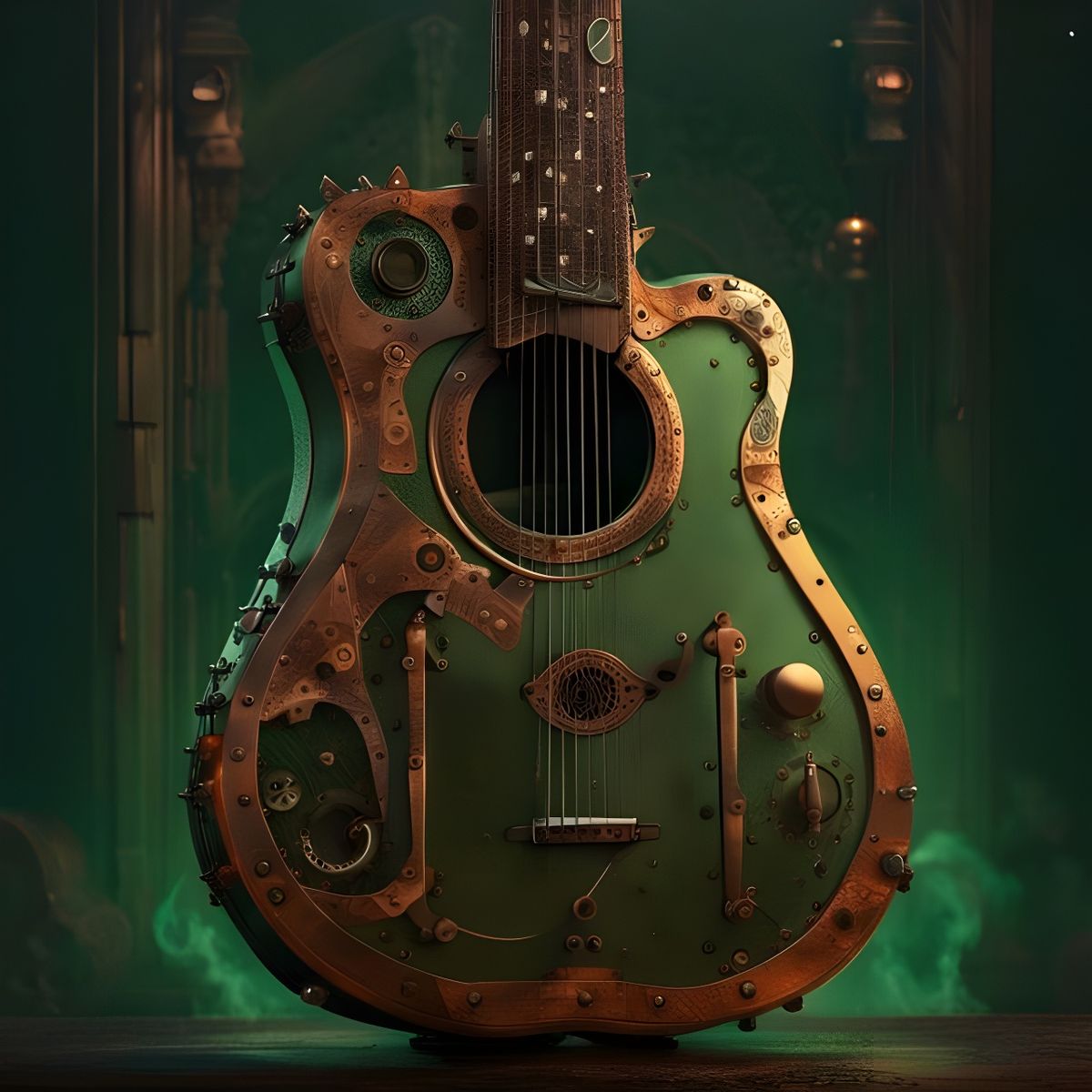 This image shows a copper acoustic guitar with vibrant colors and an oxidized green finish. The design features ornate, dynamic, and intricate steampunk elements in a digital art style.