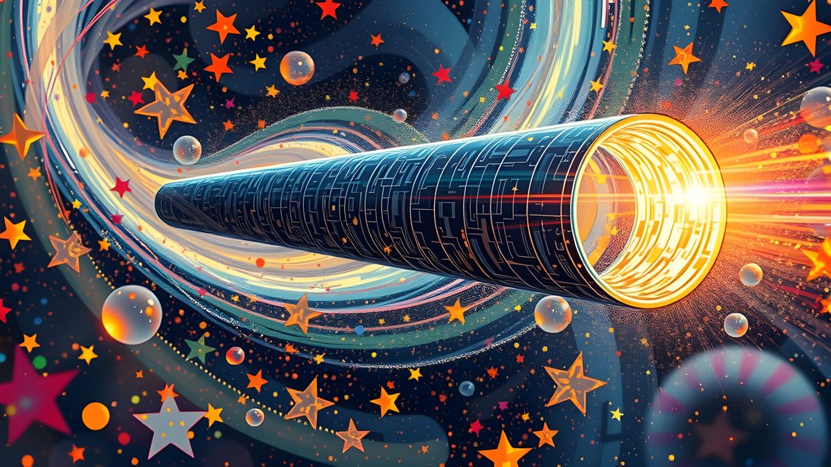 This image showcases a sleek, hollow cylinder with a rainbow enamel finish, emitting a high-velocity iridescent exhaust. It features a tempestuous vortex of vivid impasto oil paint and swirling 3D stars, evoking a dynamic and emotive texture with bold colors.