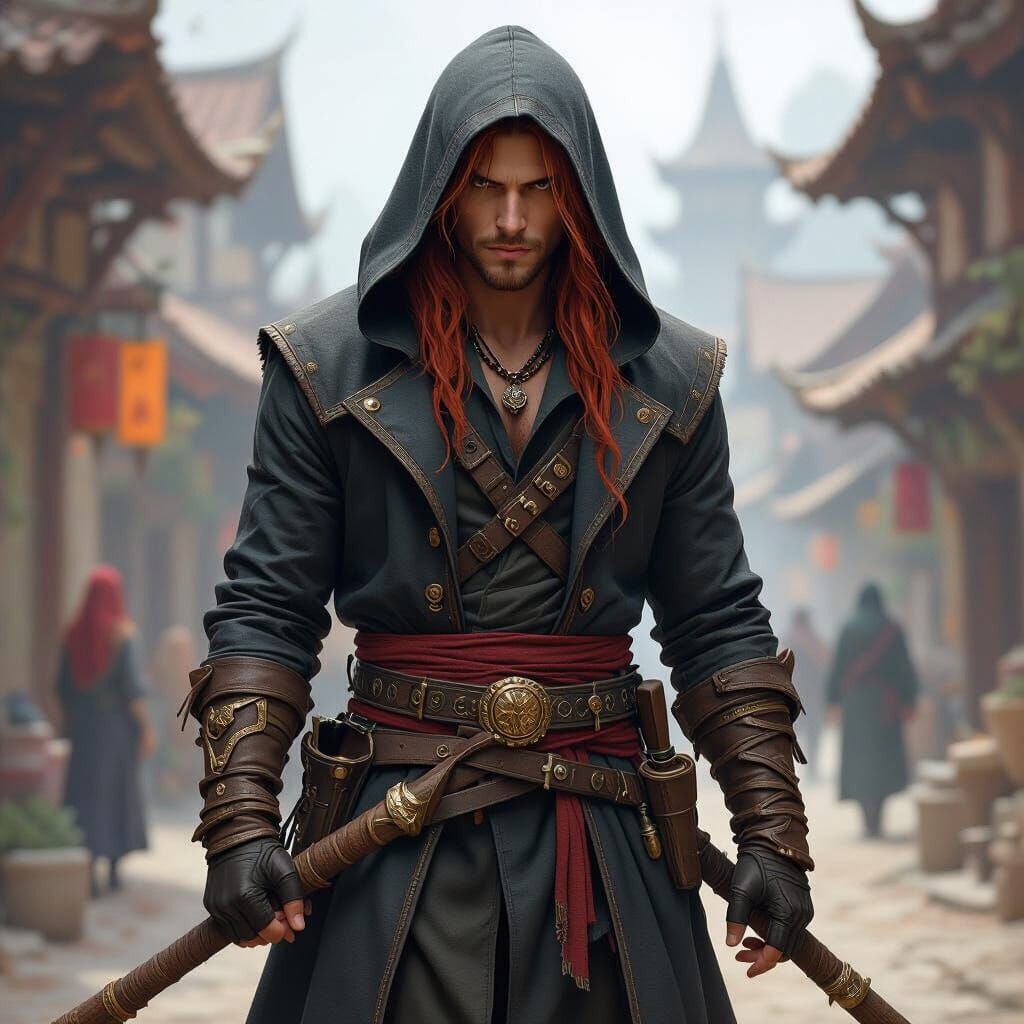A cunning redhead thief with long, unkempt hair wields a golden-adorned wooden weapon in a detailed fantasy village. Rendered in a matte painting style with deep, complementary colors.