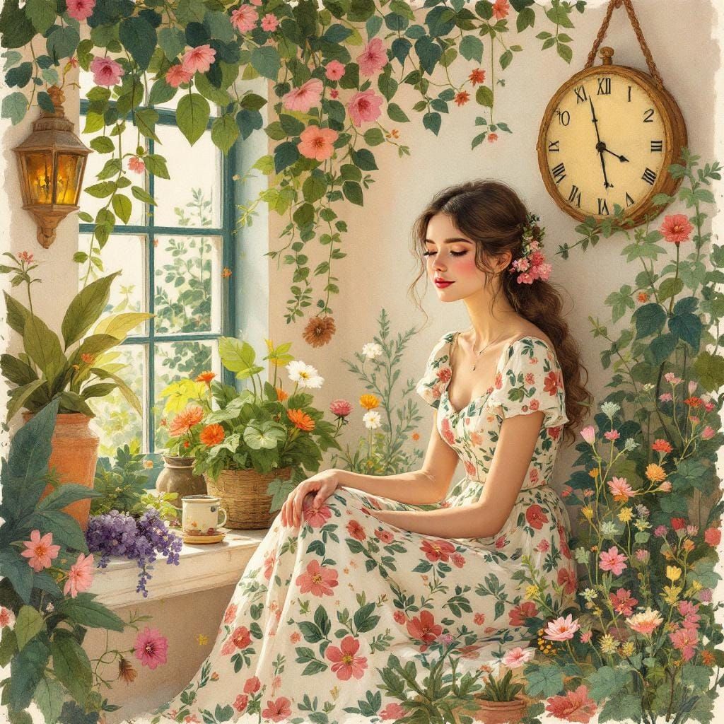 A charming image of a woman in a floral dress relaxing in a cottage. The scene, bathed in soft, warm light, is reminiscent of classic children's book illustrations.