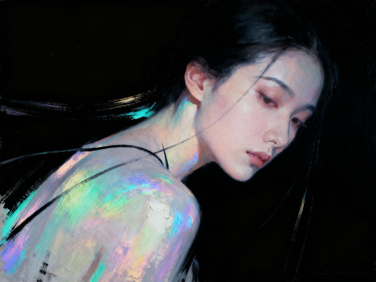 This image features a minimalist female model rendered with abstract brushstrokes and iridescent colors on a black background, showcasing a dramatic and sleek aesthetic.