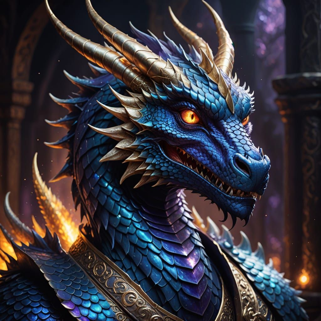 A striking picture of a majestic dragon's face. The dragon features shimmering scales in shades of purple and blue, glowing eyes, and golden markings. This vibrant digital art evokes a mystical and magical atmosphere.