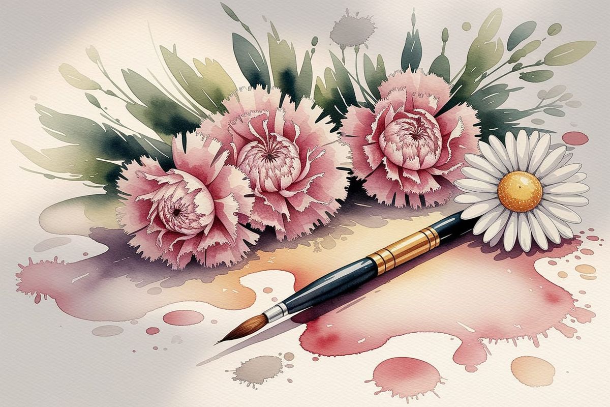 A watercolor painting of carnations and daisies with a paintbrush. Puddles and splatters of neutral paint add to the vintage aesthetic. The warm lighting enhances the fluid strokes.