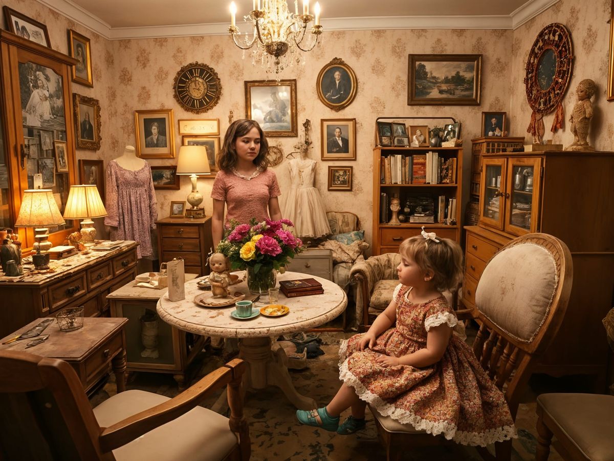 This image captures a nostalgic scene of childhood wonder, blending handmade crochet clothing with vintage flea market finds and mismatched furniture, set against a backdrop of neon pastel colors and worn, secondhand charm.