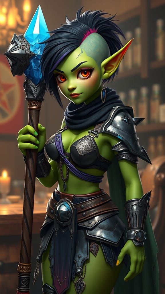 This image shows a short, green-skinned goblin woman in a tavern, wearing bikini armor made of scraps, a metal kilt, and wielding a warhammer with a blue crystal. Her striking features include bright orange eyes, pink and purple hair stripes, and black eyeliner.