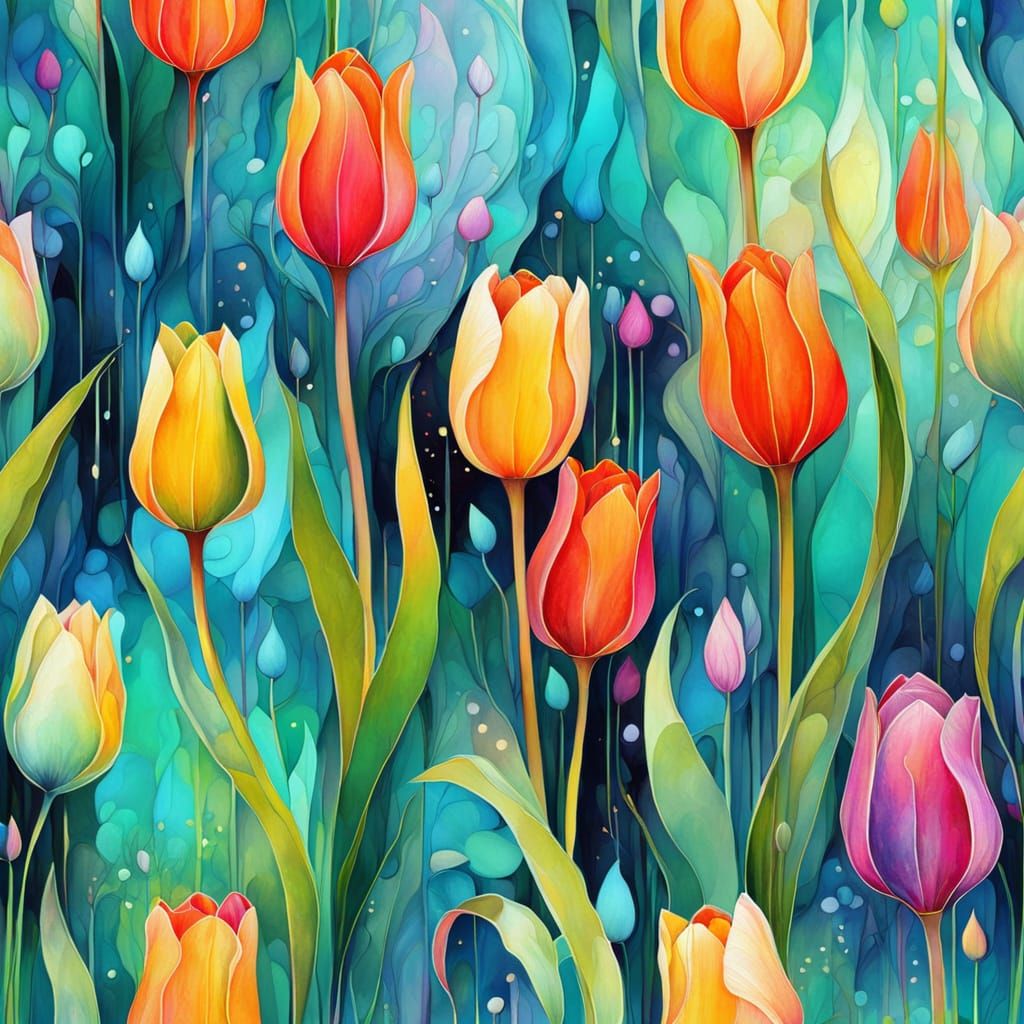 This image shows abstract tulips in a magical, arabesque style. The artwork uses liquid alcohol ink and a triadic color scheme to create a vibrant spring scene.