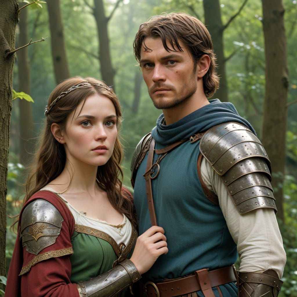 This image depicts a fearless warrior and his elegant companion amidst the turmoil of early Norman rule in medieval England. A striking representation of a violent time period.