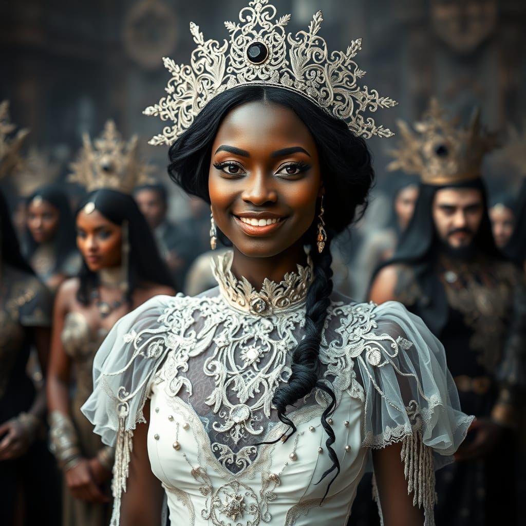 A photorealistic image shows a smiling, dark-skinned woman in a white gothic dress and headpiece. The background features detailed gothic figures in a high-contrast and moody atmosphere.