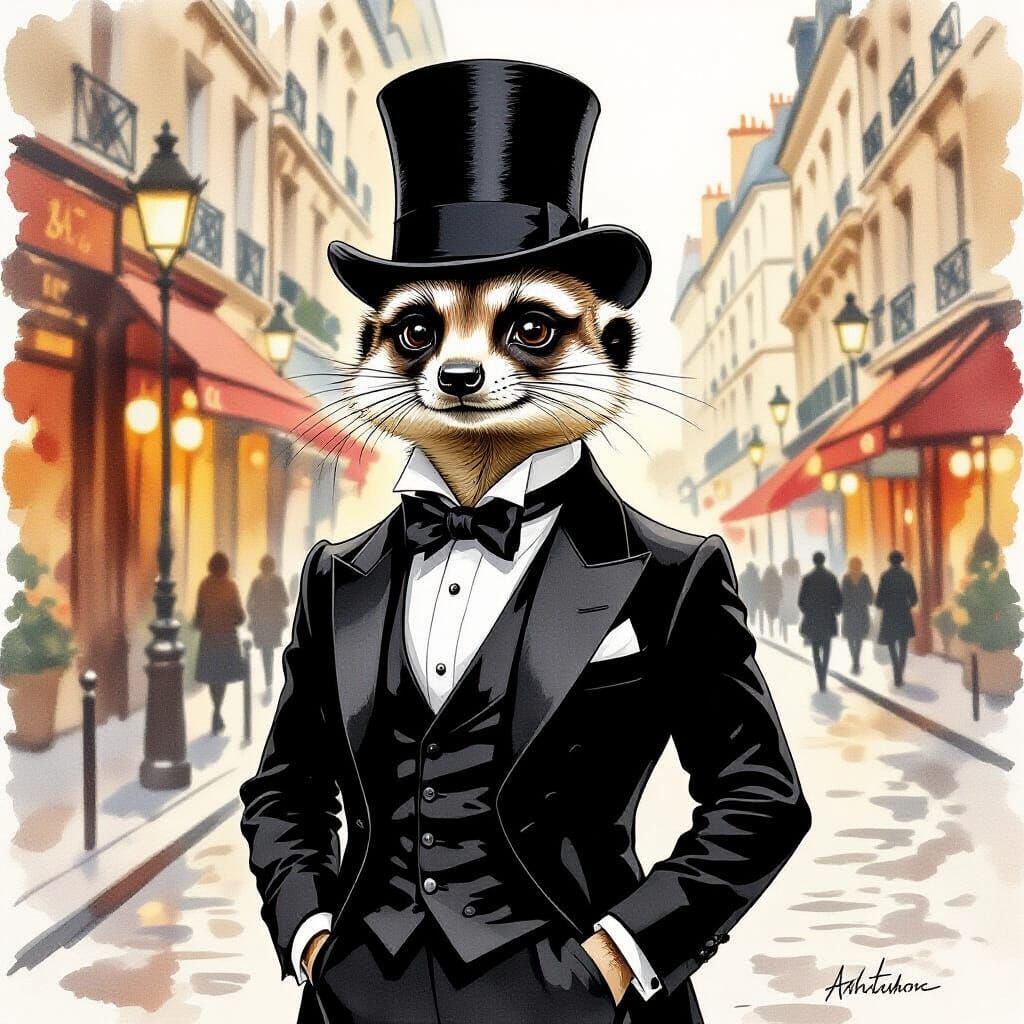 A dapper meerkat in a suit and top hat stands on a Parisian street, depicted in a loose watercolor style with warm sepia tones and soft morning light.