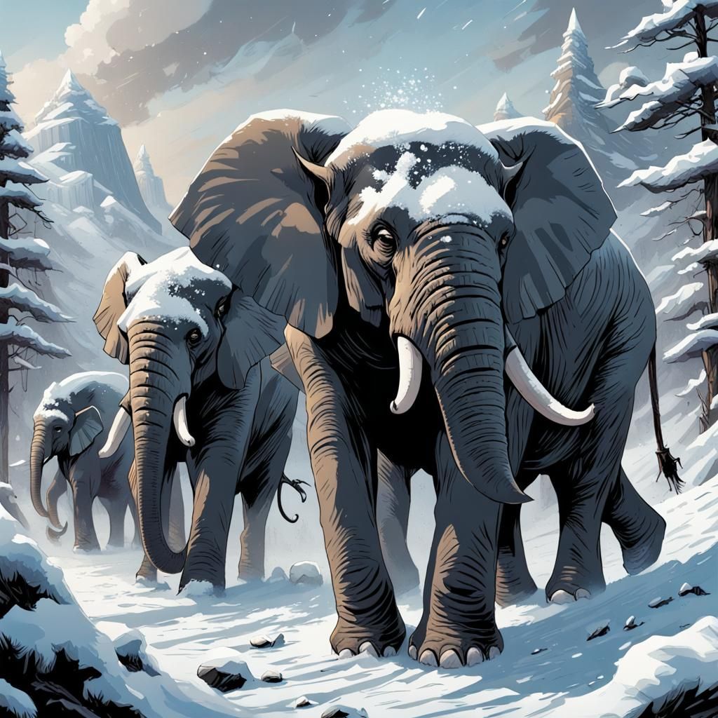 A striking picture of elephants walking through a snowy desert landscape. The image is rendered in a comic book art style, with smooth lines and perfect composition.