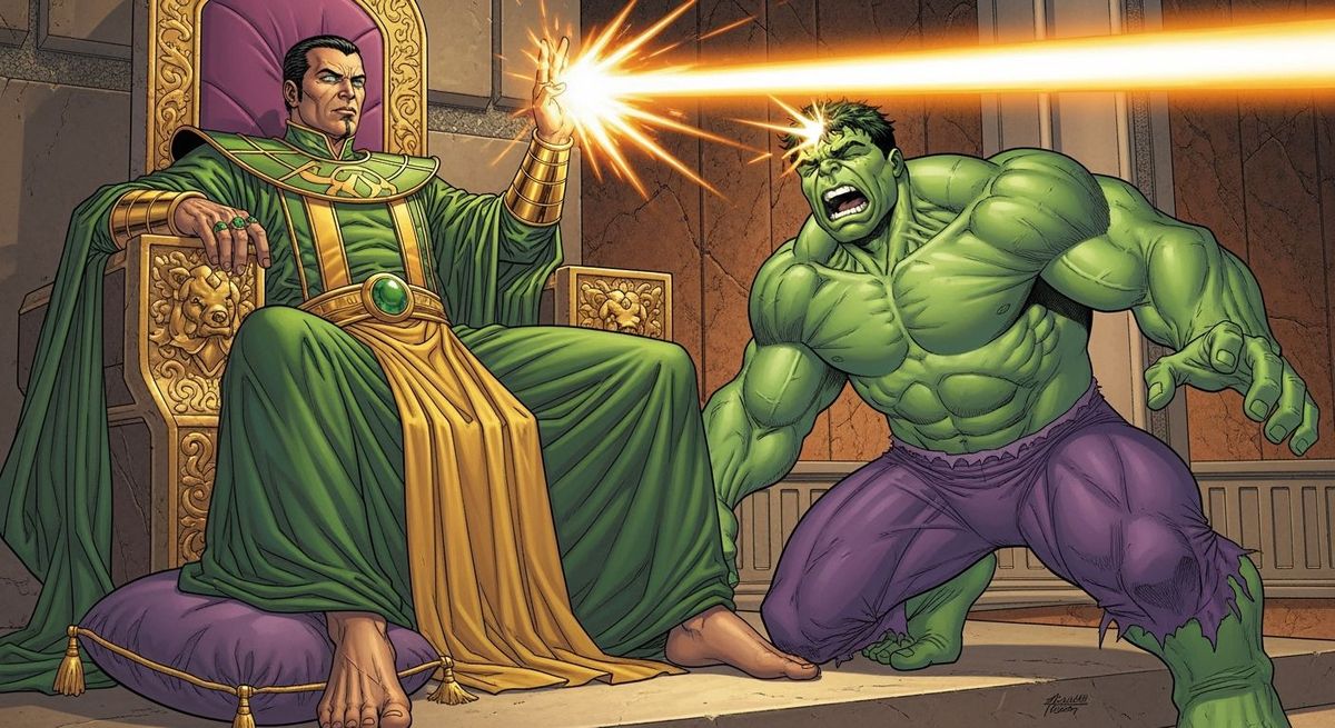 This image shows the Mandarin on his throne, wearing a green and yellow toga. He uses one of his rings to fire an energy beam at the Incredible Hulk, who is knocked down. The scene is rendered with dramatic lighting in hyperrealistic comic book style.