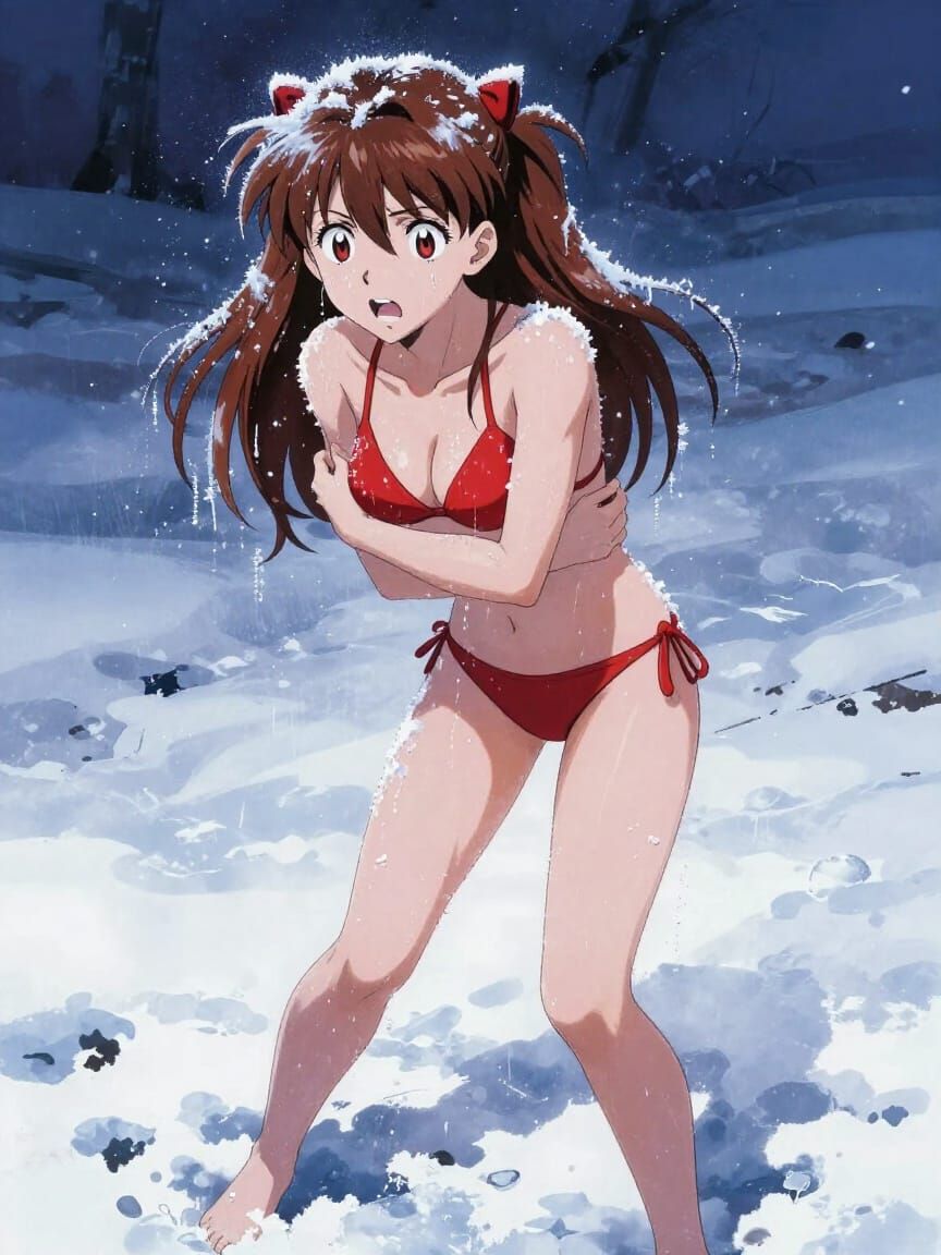 This image depicts Asuka Langley in a red bikini, caught in a snowy landscape. She is covered in frost and icicles, shivering from the cold water, rendered in a dramatic, painterly concept art style.