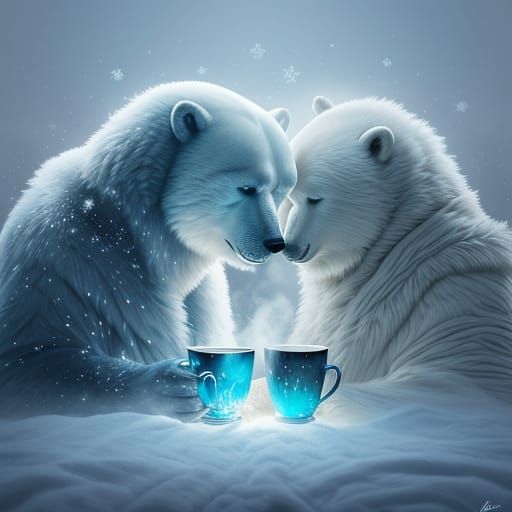 This digital painting shows two polar bears finding warmth under a duvet, connected by a glowing USB cable. They hold steaming cups of tea in a detailed winter scene.
