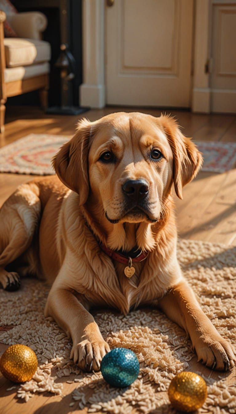 This warm and inviting oil painting depicts a happy Labrador lying on a dog bed, surrounded by a bowl of dog food on a parquet floor. The soft focus and gentle play of shadows create a cozy atmosphere, while the brushstrokes of warm golden light on the dog's fur add a sense of realism and texture.
