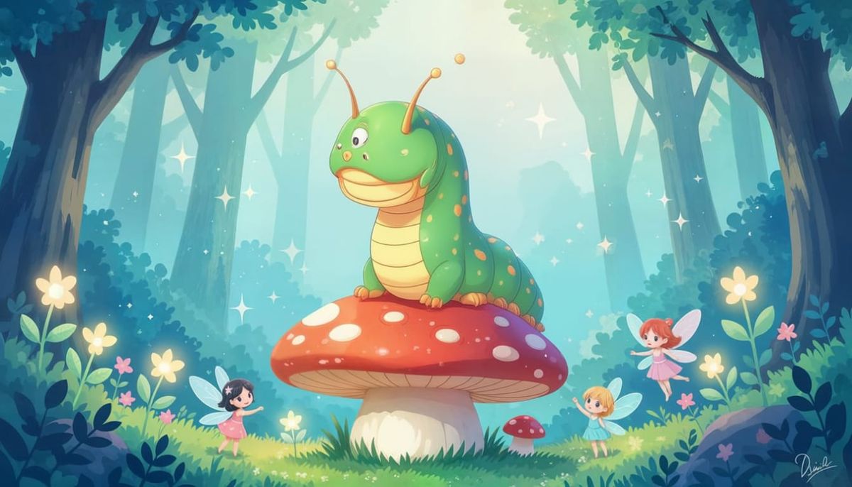 A whimsical chibi dragon, with big, sparkling eyes and tiny, adorable wings, sitting atop a giant, colorful mushroom in an enchanted forest with his Fairy Friends.