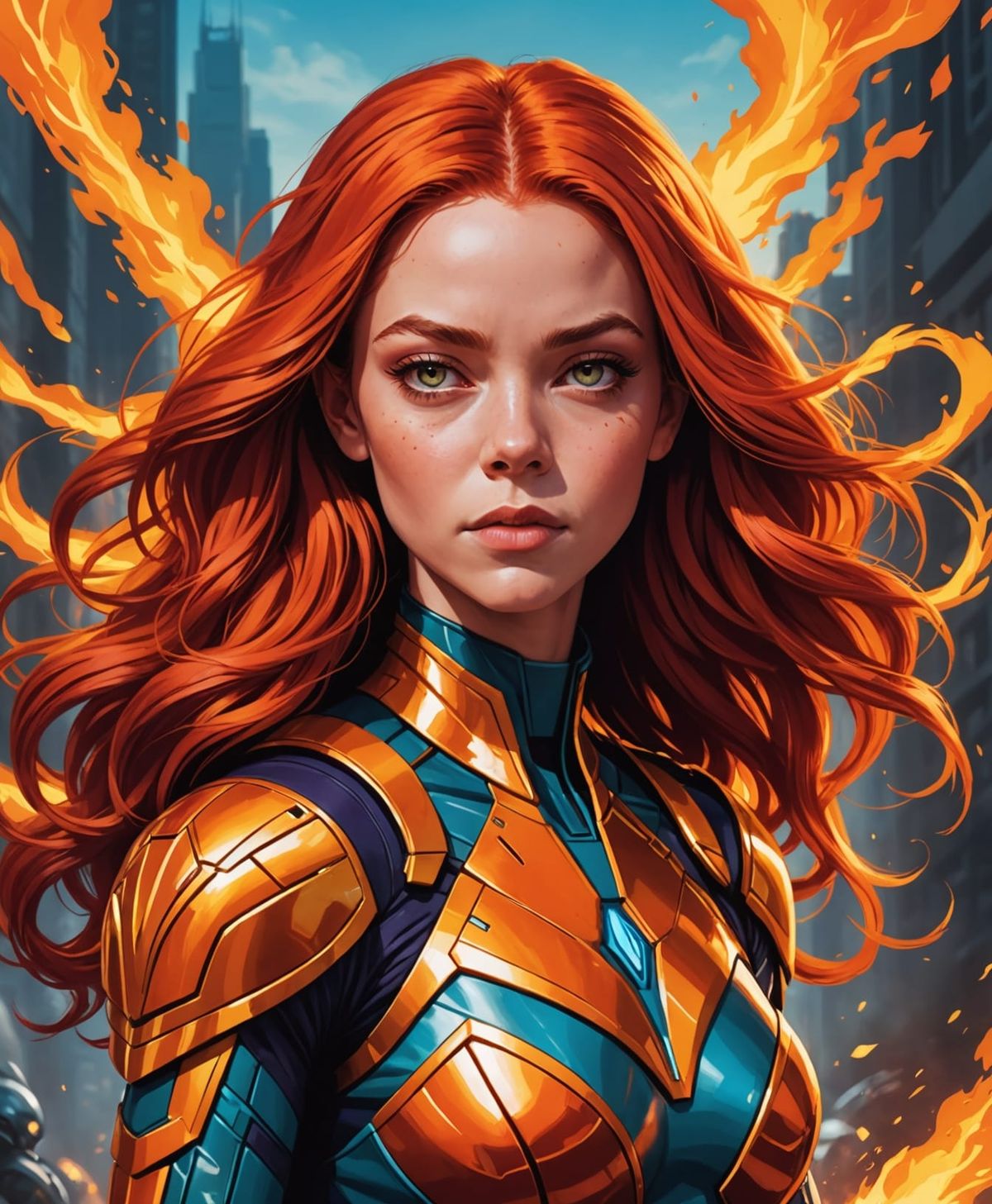 A cinematic portrait of actress Sydney Sweeney with orange skin and flaming red hair as alien princess and superheroine Starfire, from DC's Titans.