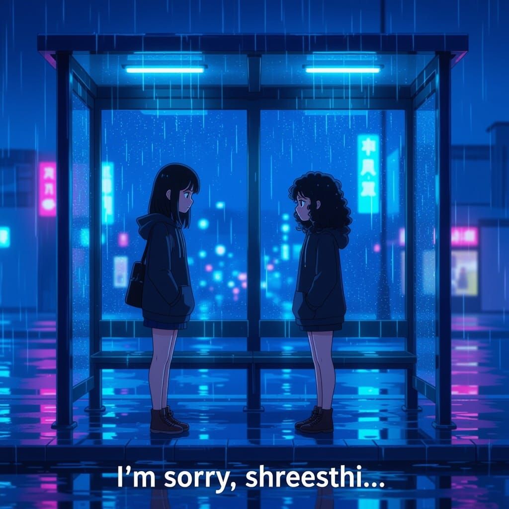 This anime-style illustration depicts a sad girl with straight hair gazing at another under a bus stop shelter on a rainy night. Wet ground reflects neon lights, creating a cinematic mood.