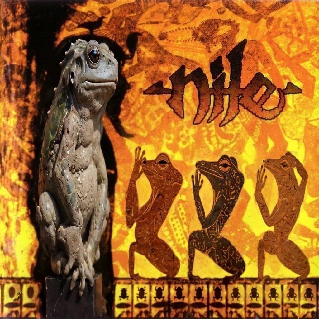 This image shows detailed frog hieroglyphs in an ancient Egyptian style. The artwork uses a limited colour palette to create a cohesive and striking visual.