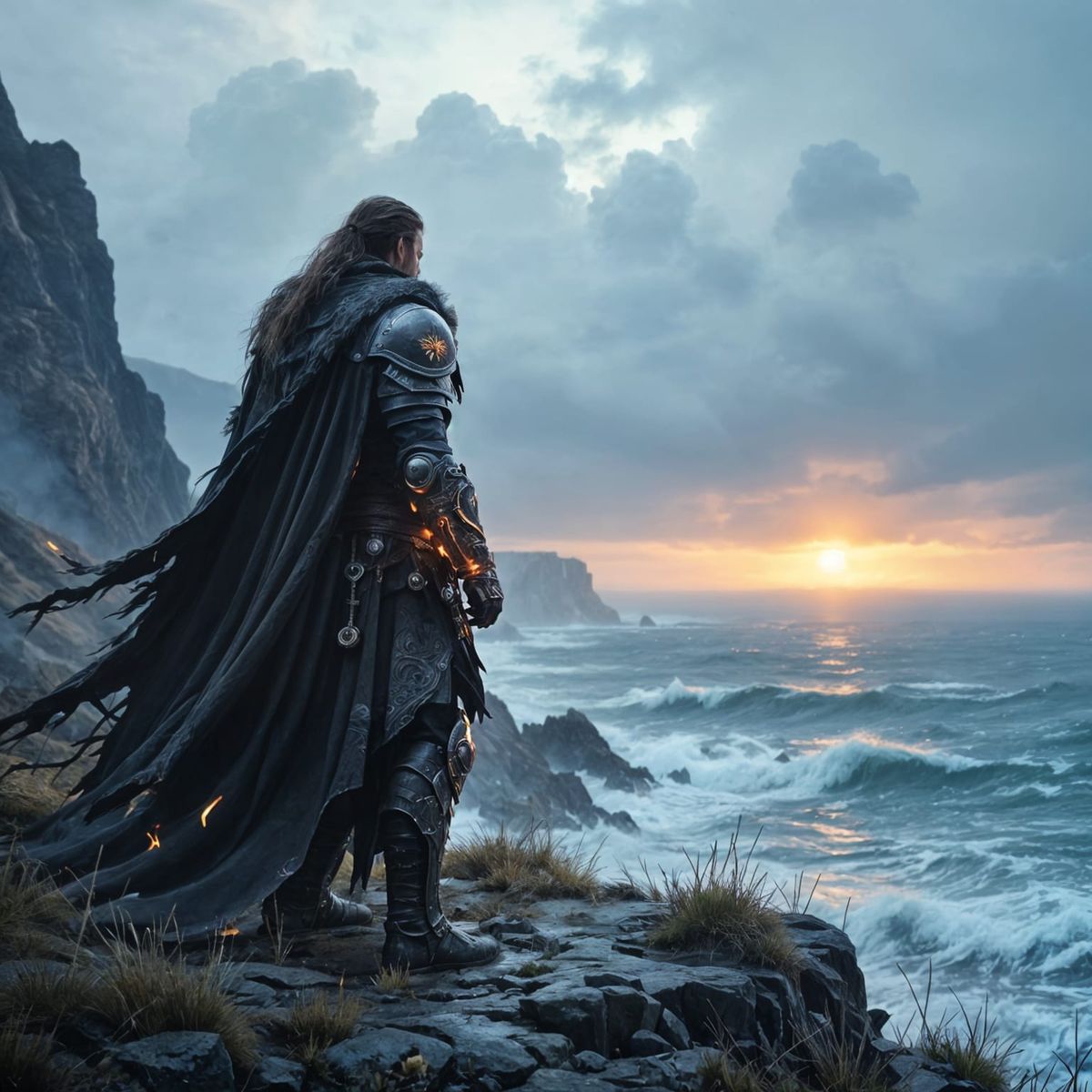 This image shows a fusion of a Viking warrior and knight in obsidian armor on a cliff. Runes glow on the armor. A dark cloak billows around the figure against a turbulent sky in a hard gothic dark fantasy style.