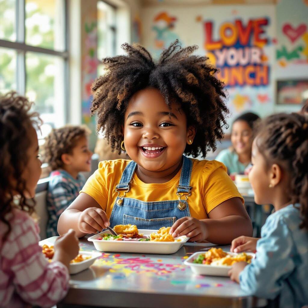 A beaming young Black girl happily selects her school lunch. This image features a vibrant, colorful graffiti art style with high contrast and detailed splash art.