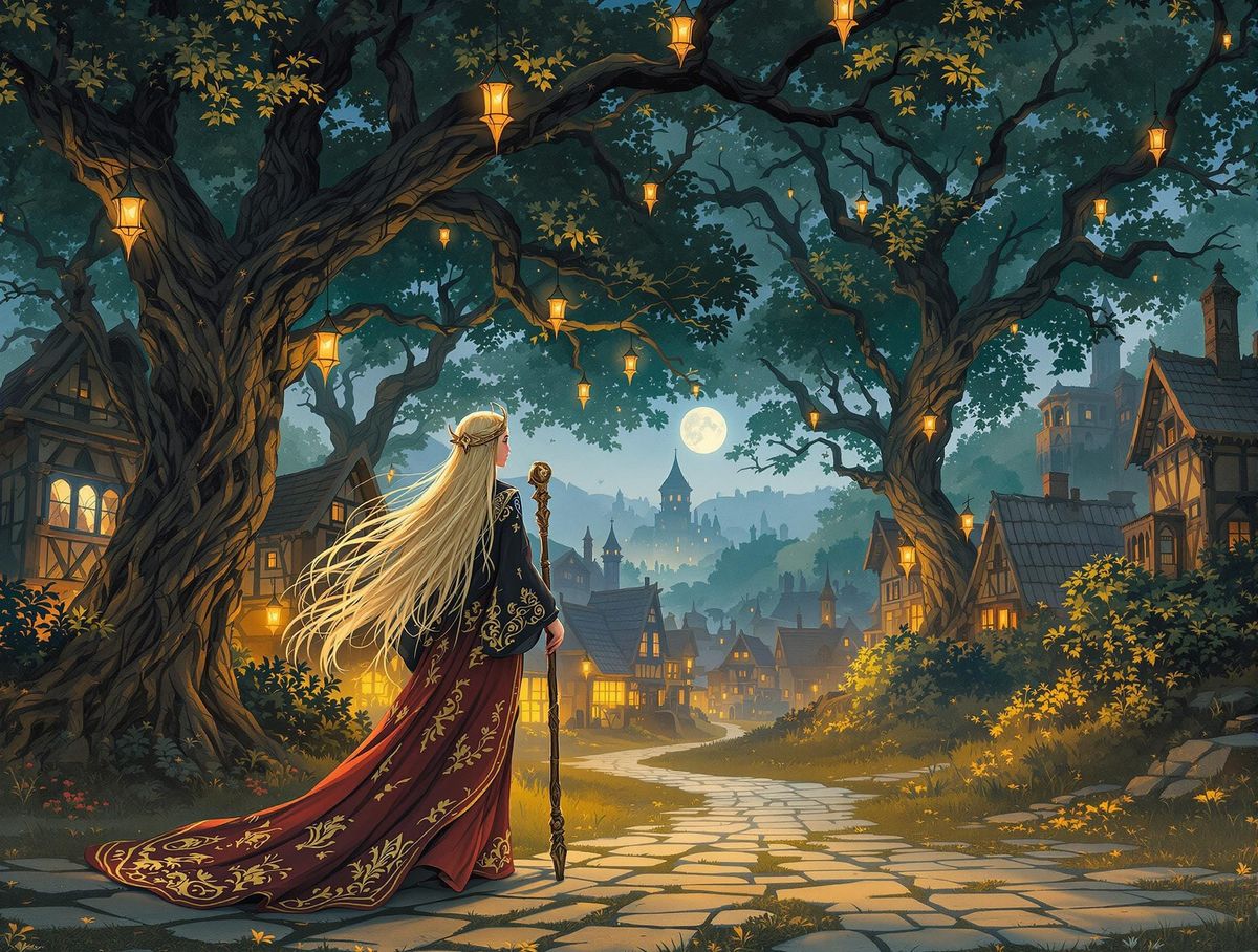 This image shows a Norse goddess walking through an ancient village at twilight. Warm colors and intricate details create a mystical scene reminiscent of classic fantasy art.