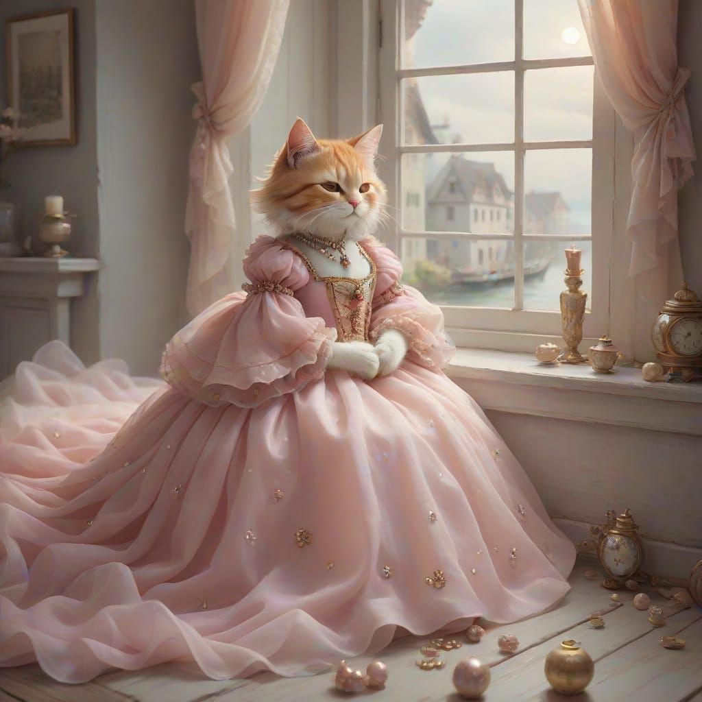 This image shows a woman in a ball gown with a kitten, watching the sunrise over the ocean. The scene evokes a surreal and dreamy anime style, with a whimsical and fanciful atmosphere.
