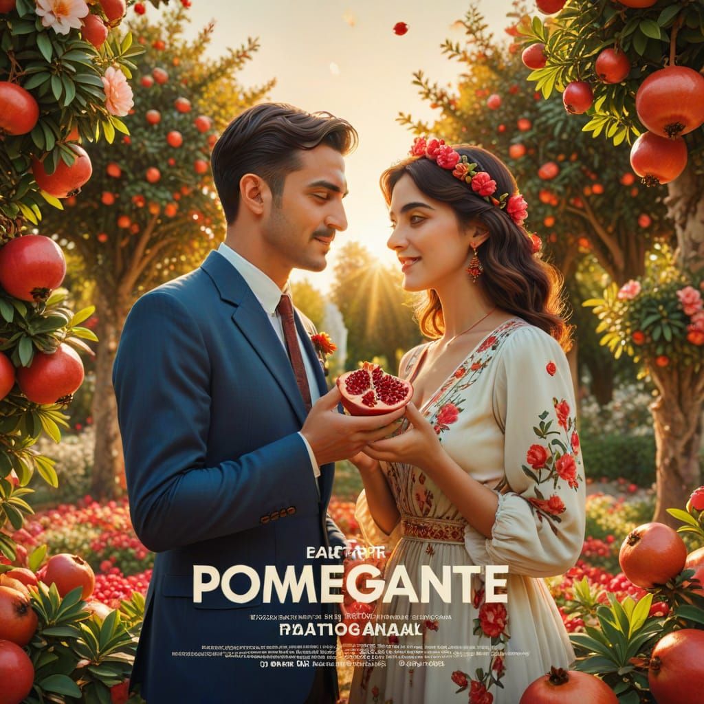 This image shows a vintage travel poster of a young Turkish couple sharing a pomegranate in a flower park. The poster features a retro color palette, bold typography and art nouveau floral patterns.