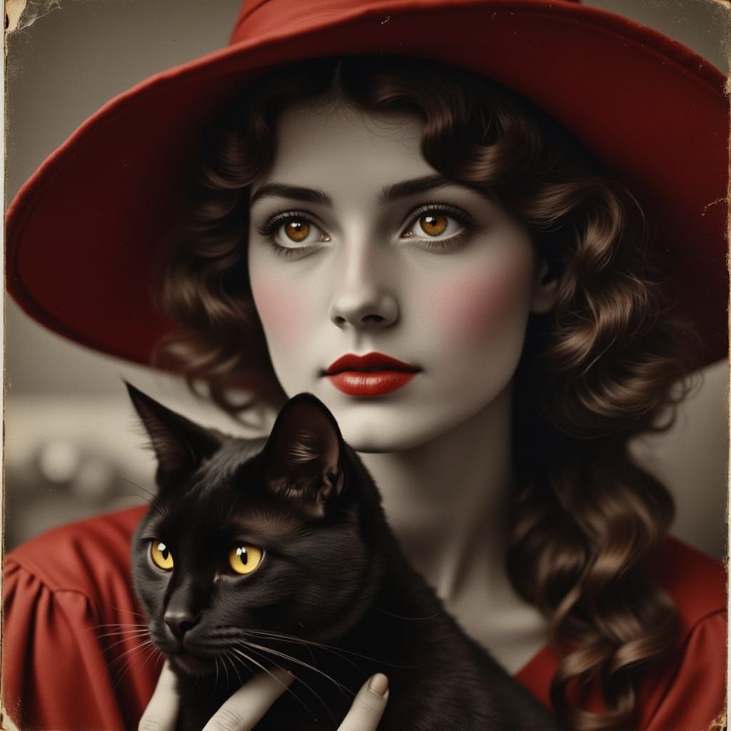 A vintage monochromatic portrait of a glamorous woman in a red witch's hat and cape, holding a black cat with yellow eyes. Features dramatic lighting and subtle imperfections.