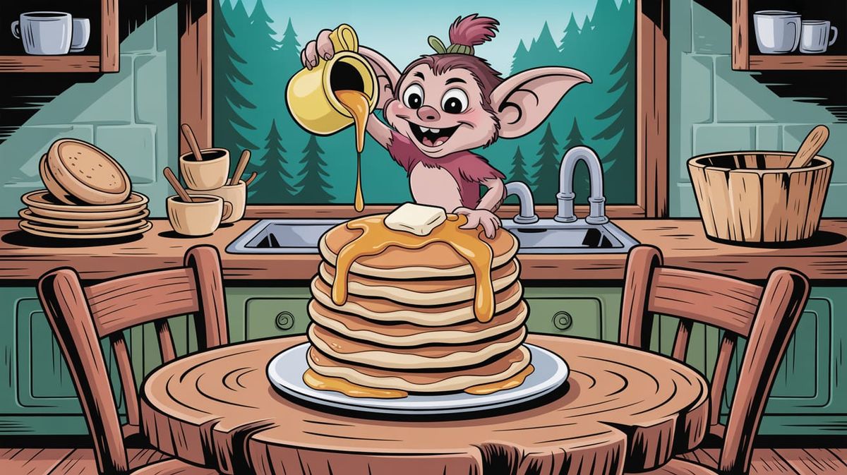A whimsical friendly little gremlin perched atop a towering stack of pancakes, gleefully pouring syrup over the sugary mountain. The pancakes are perfectly round and golden brown, with melting butter glistening on top. The gremlin has a playful expression and is adorned with quirky accessories like goggles ...