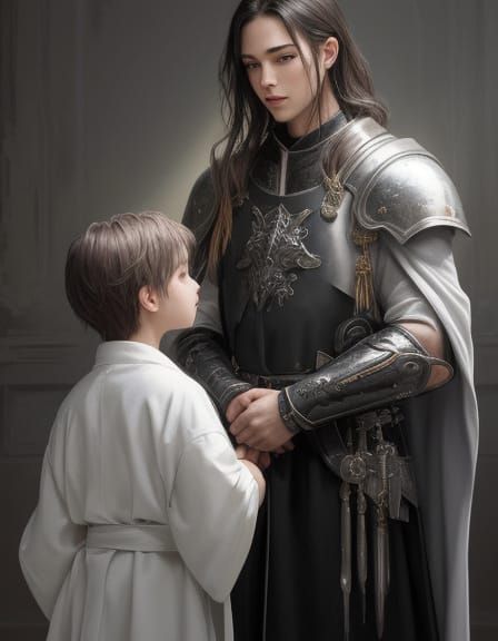 A grunge oil painting featuring two young boys, one in a white robe and another in black armor. The image captures a dualistic theme with vibrant colors and soft lighting.