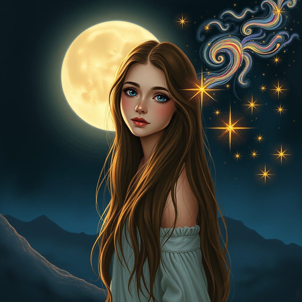A woman stands on a moonlit mountaintop, painting vibrant stars into the night air with a glowing brush, surrounded by a velvety black sky and delicate textures.