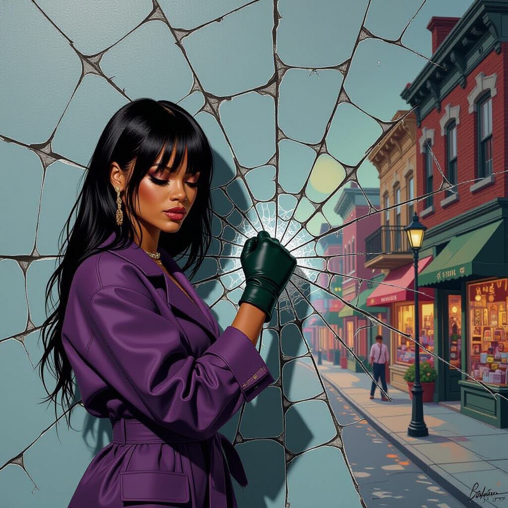 This image shows Rihanna in a dark outfit standing next to a cracked wall. A trompe-l'Εil mural of a vibrant city street is fractured by a spiderweb-like crack pattern, rendered with airbrushed perfection.