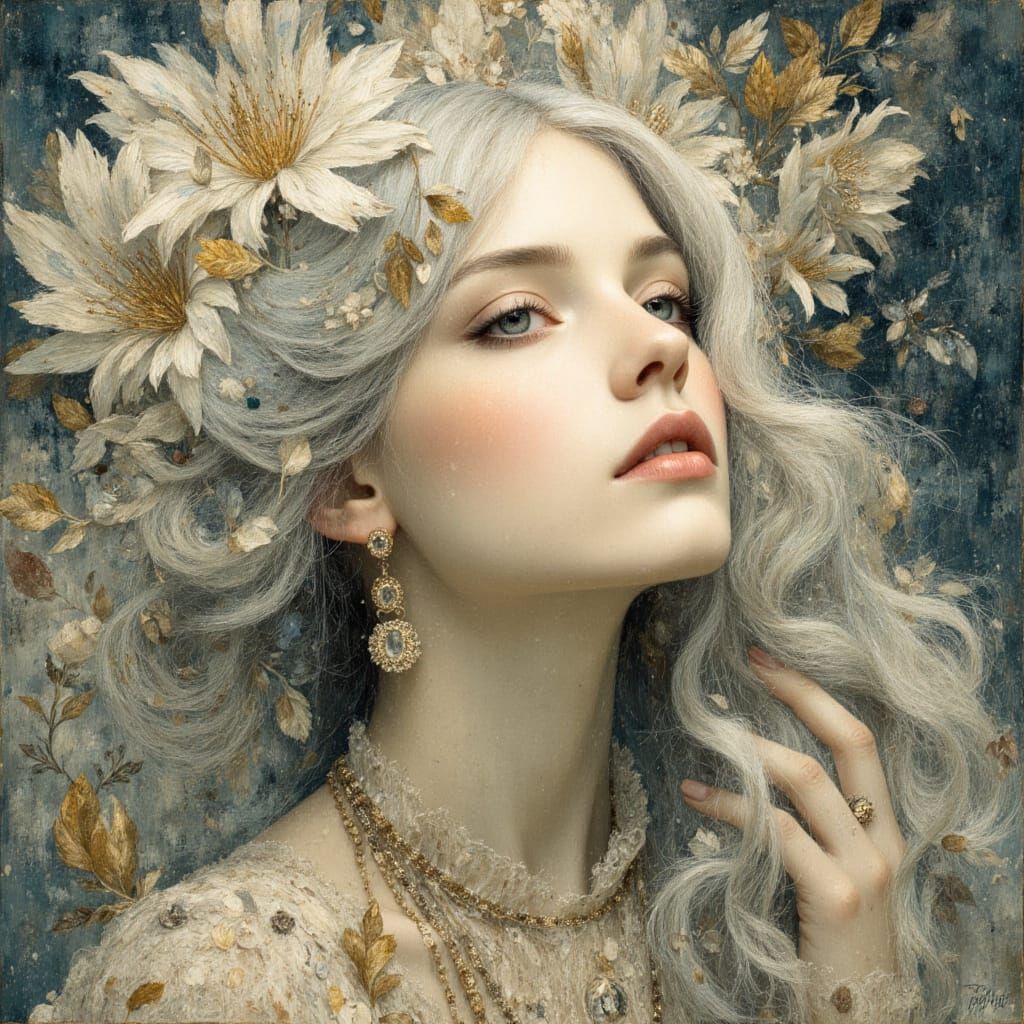 A serene portrait of a silver-haired woman with floral adornments. The image has an earthy color palette, ethereal lighting, and surreal abstractness, creating a dreamlike, watercolor collage aesthetic.