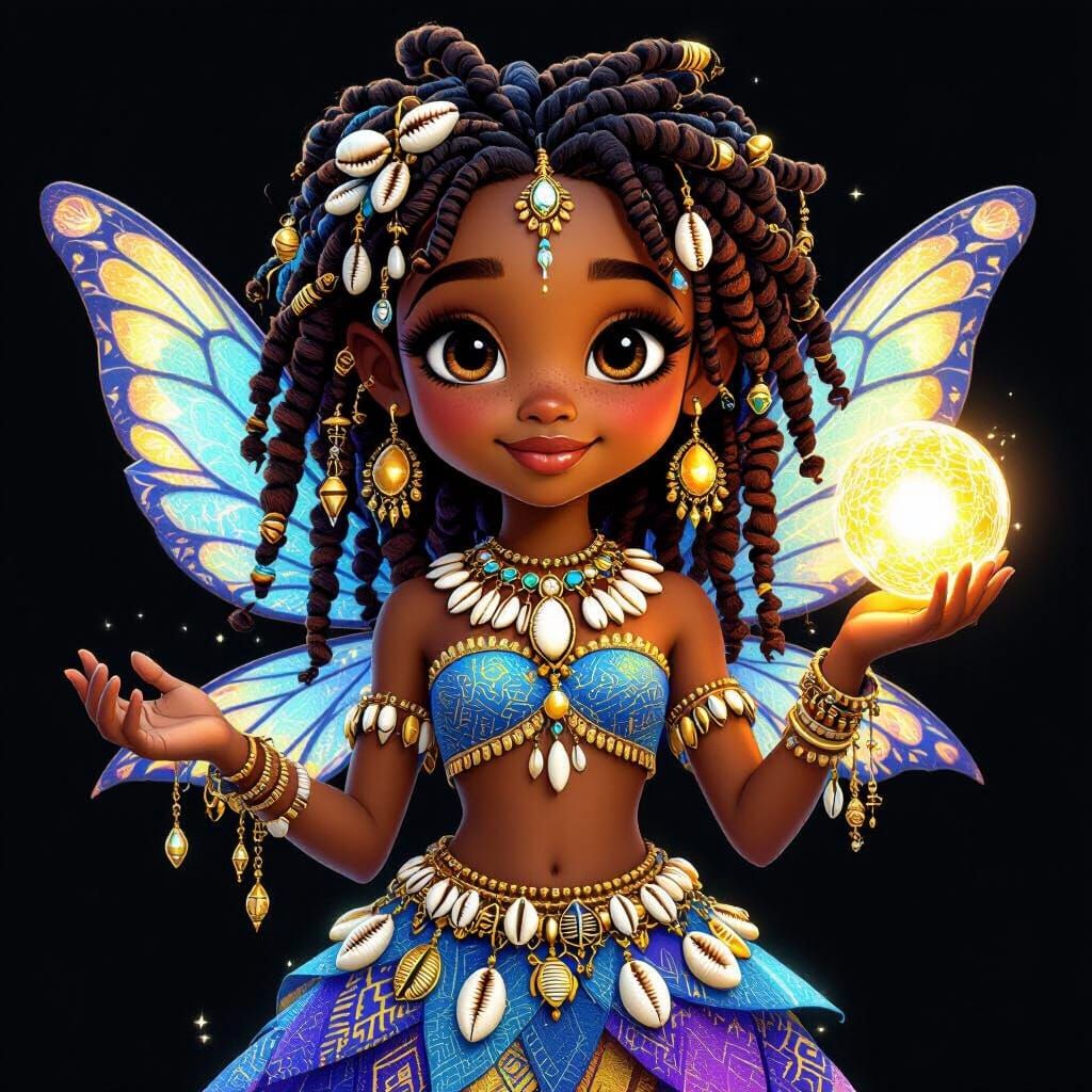 This image shows a Black fairy girl with locs and golden jewelry, holding a glowing orb. This Pixar-style fantasy scene is rendered with soft lighting and intricate 3D shading.