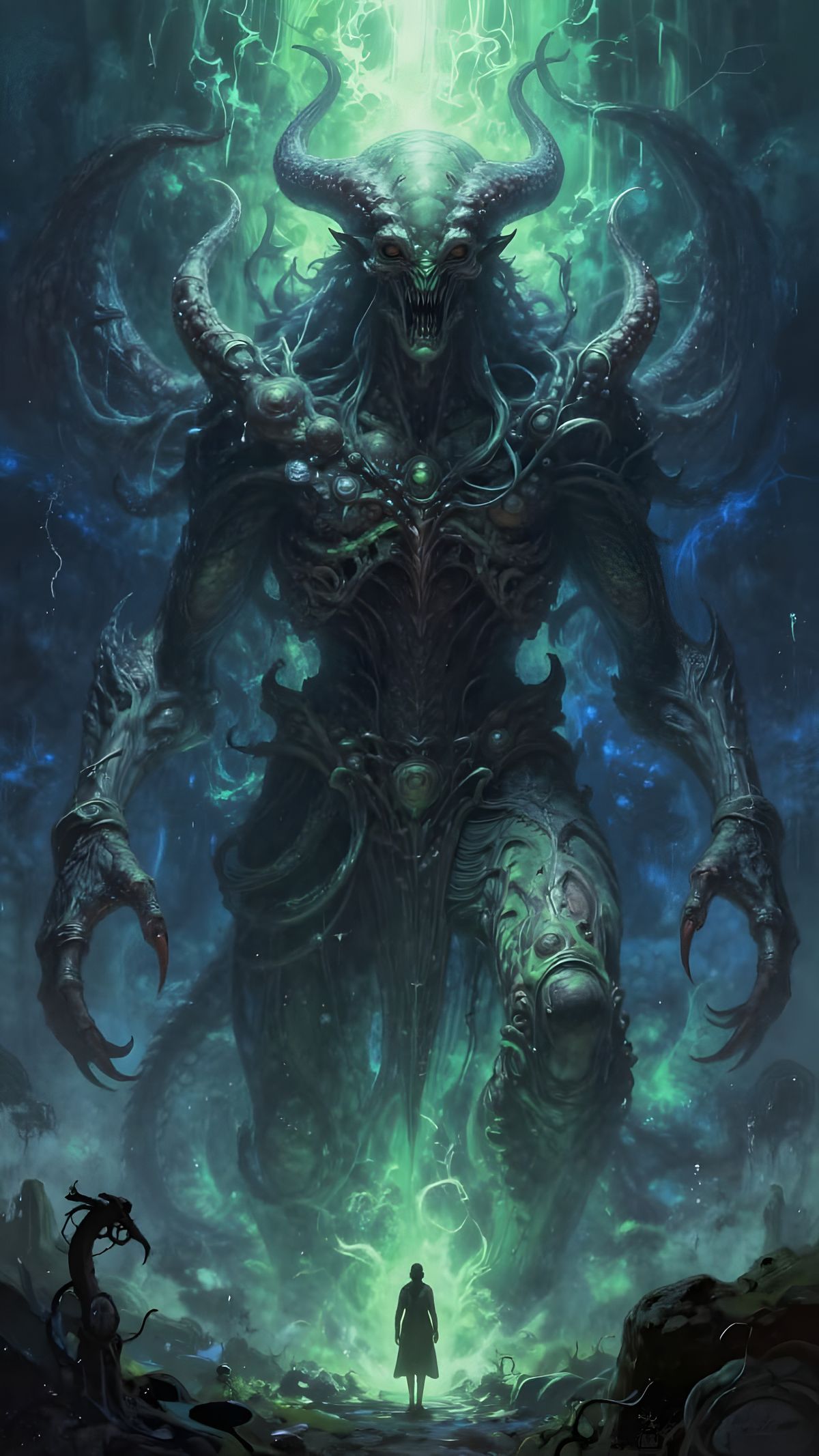 This image depicts a stunningly detailed and atmospheric Lovecraftian horror scene. The artwork features a spectacular scale with a sinister and hyperrealistic aesthetic.